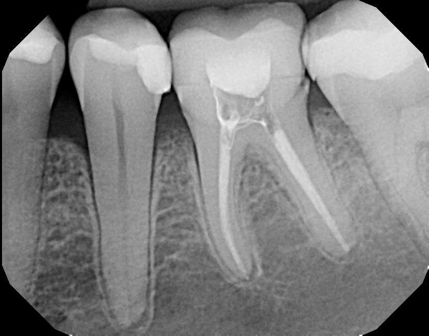 This first mandibular molar (tooth #19) developed decay from a lack of flossing or did not have all decay properly removed. An experienced general dentist can properly diagnose a cavity with 6 month check up exam and x-rays to avoid extensive work requiring root canal therapy and crown. Always ask your dentist for a consultation with a root canal specialist if you are uncertain of a possible developing tooth problem.